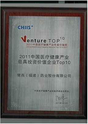 2011年7月14日,在北京举办的2011第五届中国医疗健康产业投融资峰会上,鹭燕(福建)药业股份有限公司荣获“2011中国医疗健康产业最具投资价值企业TOP10”称号。公司于2010年引进建银国际医疗产业基金等投资者近1.5亿元投资后,在公司治理、经营业绩、战略布局等方面得到进一步提升,巩固了公司在福建省医药流通领域的龙头地位。