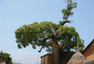 (蓝天,白云,古树,房屋一幅和谐美丽的“图画”)