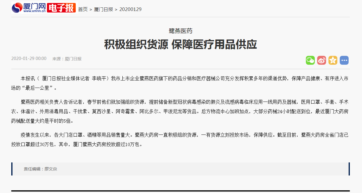 鹭燕医药积极组织货源 保障医疗用品供应